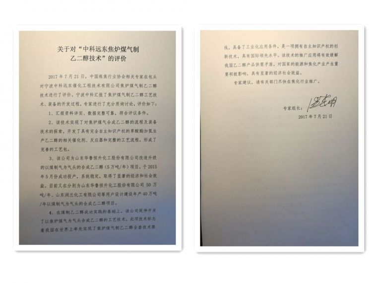 以上技術(shù)受到與會(huì)多家生產(chǎn)企業(yè)的關(guān)注,并在會(huì)議期間進(jìn)行了深入交流。中國煉焦行業(yè)協(xié)會(huì)相關(guān)專家對我公司“焦?fàn)t煤氣制乙二醇技術(shù)”進(jìn)行了現(xiàn)場質(zhì)詢和討論,最終出具了評(píng)價(jià)報(bào)告。專家們一致認(rèn)為此技術(shù)具有國際領(lǐng)先水平,推廣應(yīng)用后能有效緩解我國乙二醇產(chǎn)品供需矛盾,對國家的能源和焦化產(chǎn)業(yè)的發(fā)展產(chǎn)生重要積極影響,具有顯著的經(jīng)濟(jì)社會(huì)效益,建議盡快在焦化行業(yè)推廣應(yīng)用。