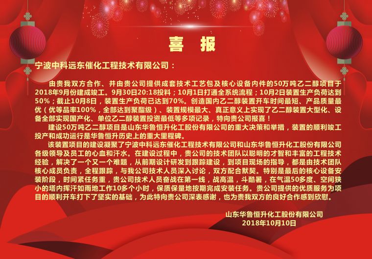 在設(shè)計(jì)和建設(shè)過(guò)程中,中科遠(yuǎn)東的設(shè)計(jì)團(tuán)隊(duì)以聰明的才智和豐富的設(shè)計(jì)經(jīng)驗(yàn),解決了一個(gè)又一個(gè)難題,從前期設(shè)計(jì)研發(fā)到跟蹤建設(shè),到開車現(xiàn)場(chǎng)的指導(dǎo),都是由技術(shù)團(tuán)隊(duì)核心成員負(fù)責(zé),全程跟蹤,與華魯恒升技術(shù)人員深入討論,雙方配合默契。為此,山東華魯恒升化工股份有限公司公司發(fā)來(lái)喜報(bào),感謝寧波中科遠(yuǎn)東催化工程技術(shù)有限公司在此過(guò)程中提供的優(yōu)質(zhì)技術(shù)和優(yōu)良服務(wù)。