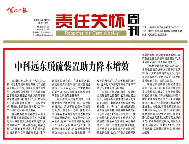 “ISS絡(luò)合鐵催化劑的成功采用,在降低脫硫系統(tǒng)整體運行費用的同時,保證焦爐系統(tǒng)滿負荷運行,達到歷史最高水平,使企業(yè)實現(xiàn)了提質(zhì)降本增效的目標。“朱承山表示。